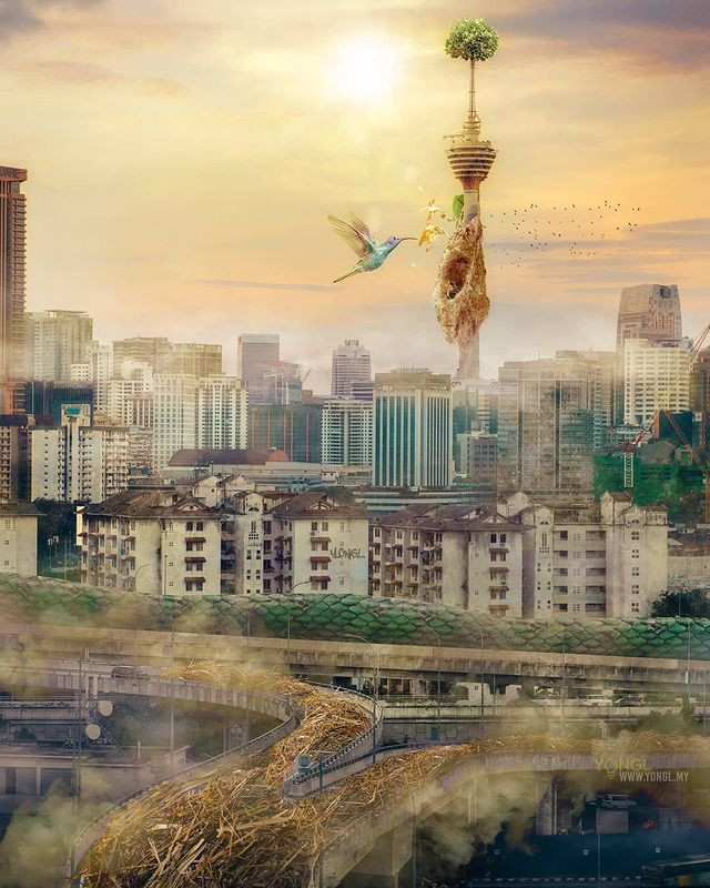 From an up-high aerial perspective that glances over the horizon, the city of Kuala Lumpur is a mere set of artificial, miniature blocks and buildings. YONGL created this series as a re‑imagination of Kuala Lumpur in a world of surrealism where nature, being the powerful force that it is, seeps into the city and becomes one with it. YONGL illustrates the importance of mankind choosing to coexist with nature; one of the most fundamental building blocks of our existence.