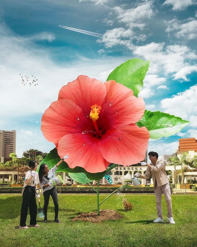 A second ‘O’ is represented by Malaysia’s national flower, the hibiscus or better known as ‘bunga raya’, the celebratory flower. Standing amidst the Independence Square, a Malay, a Chinese, and an Indian (and a cat!) are nurturing the growth of the national flower to symbolise the unity in diversity of Malaysia as well as the collective effort of people from different diverse backgrounds that help build and sustain the harmonious nation that Malaysia is today.