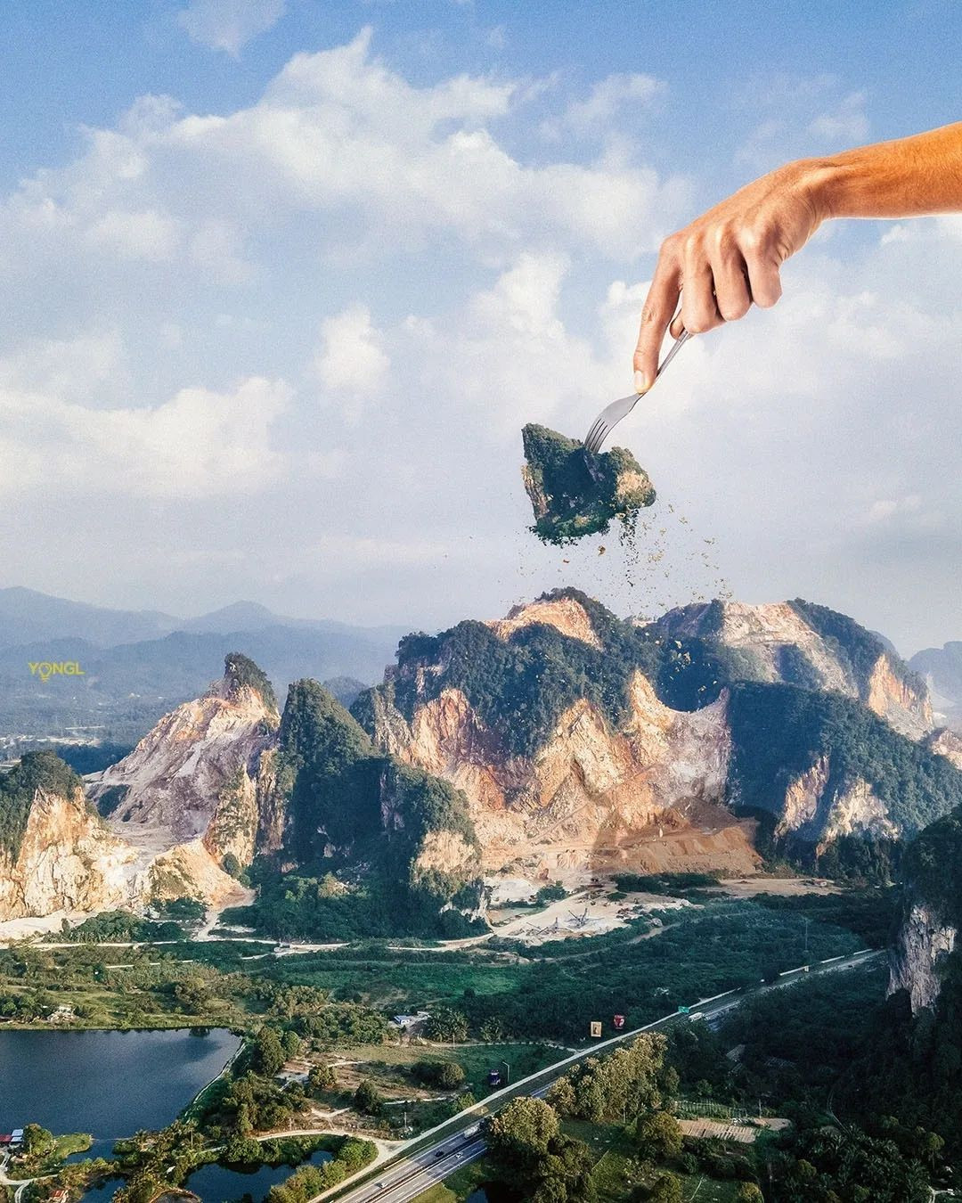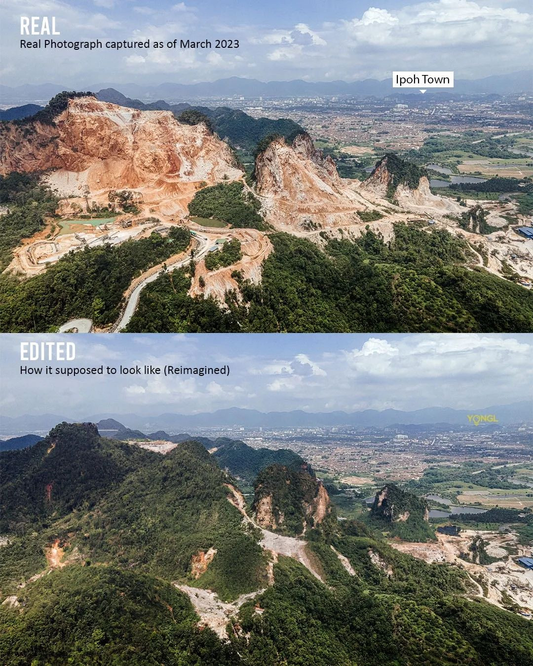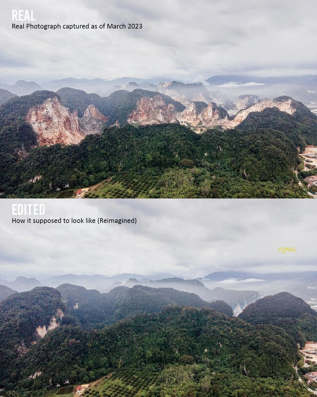 A few months ago, a viral photograph of a heavily logged mountain in Simpang Pulai, Ipoh made its rounds on social media platforms and eventually landed on YONGL’s Facebook feed. After bearing witness to the amount of damage this mountain had sustained due to quarrying activities in the area, YONGL decided to pay a visit to the site in person. What followed was a journey to Ipoh where YONGL would photograph the disappearing mountain and reimagine what the natural formation would look like without human intervention.