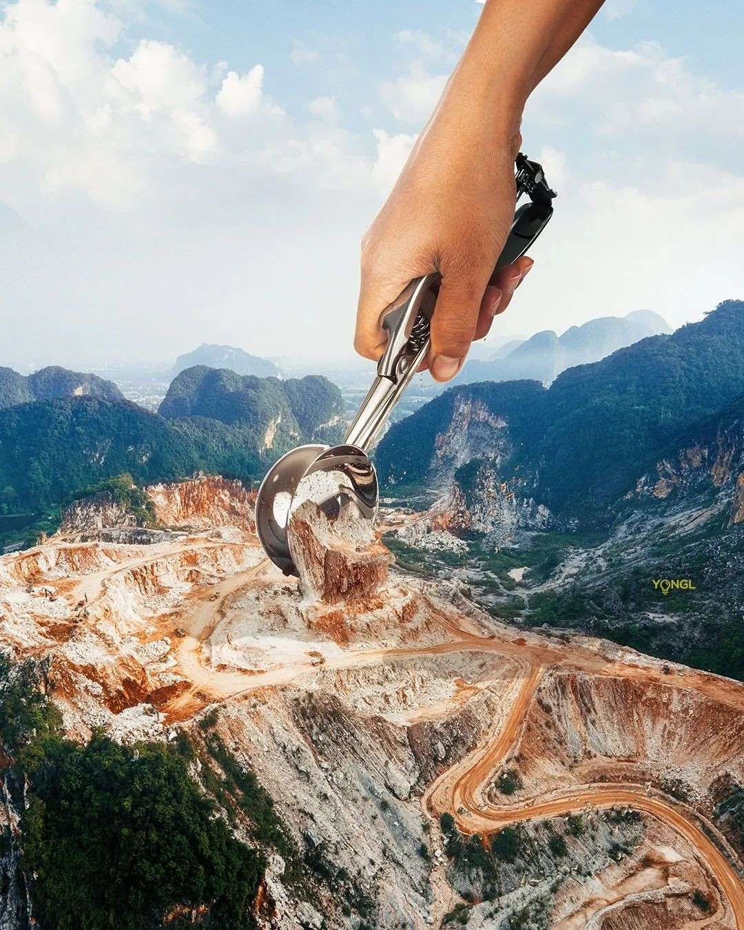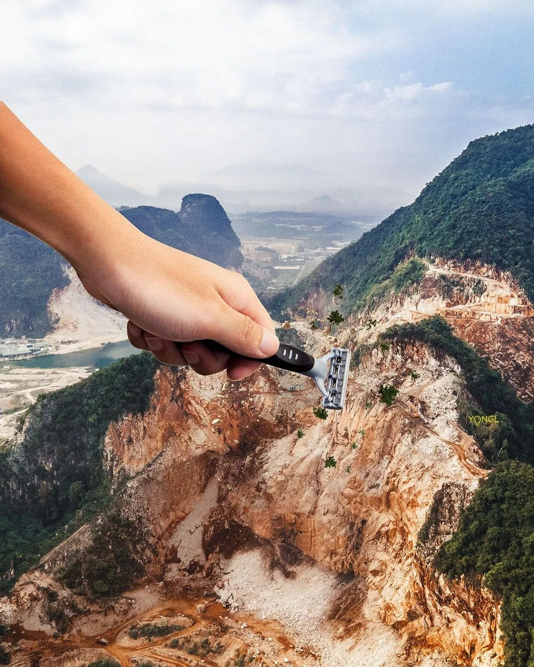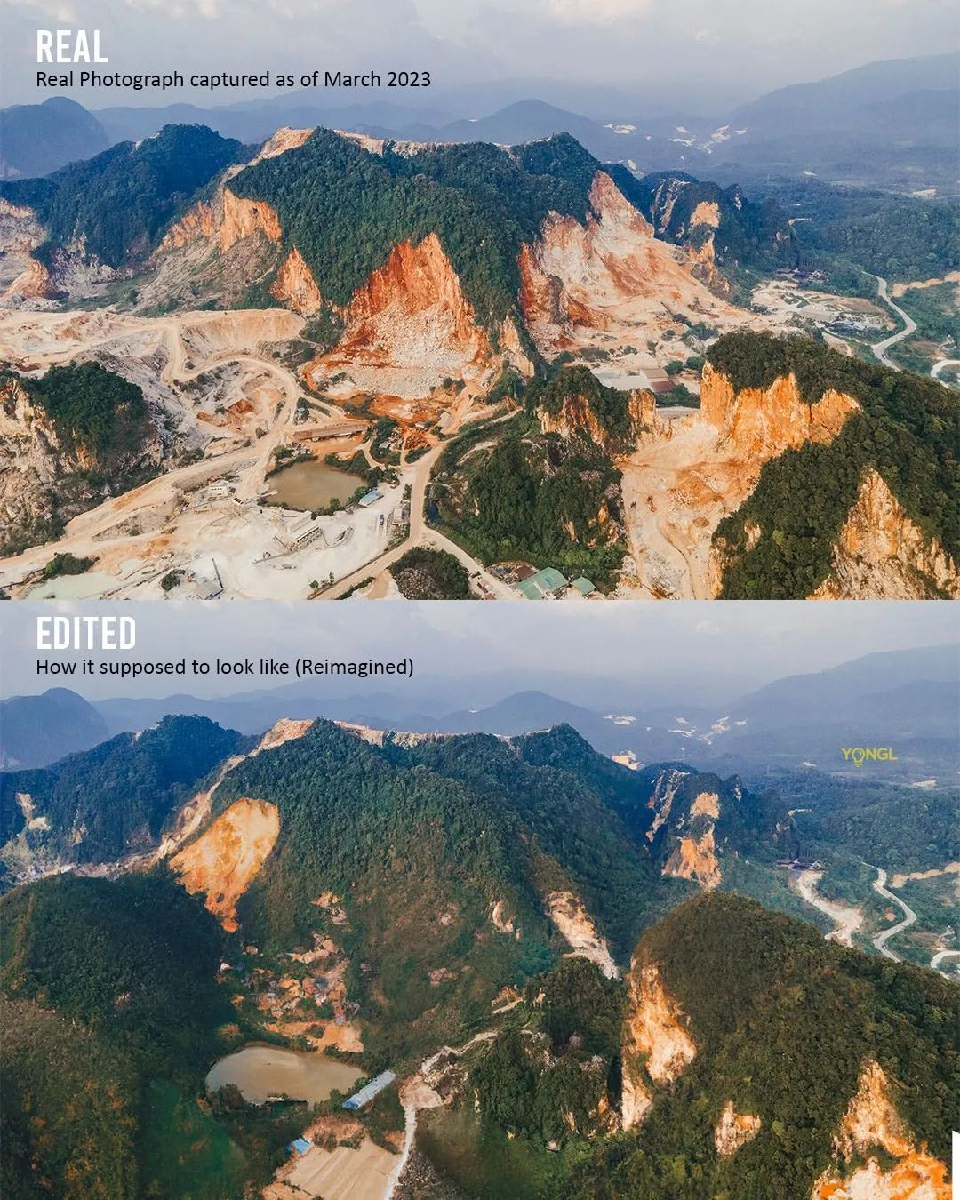 In order to drive his point home, YONGL reimagined what the mountains would look like in the present day if they had not been subjected to any mining and quarrying activities. The results are a shocking, striking contrast of an evergreen tree-covered mountain camouflaged within its green landscape in opposition to a naked rock formation that has been stripped bare to reveal the limestone within that loudly contradicts the green in its surroundings.