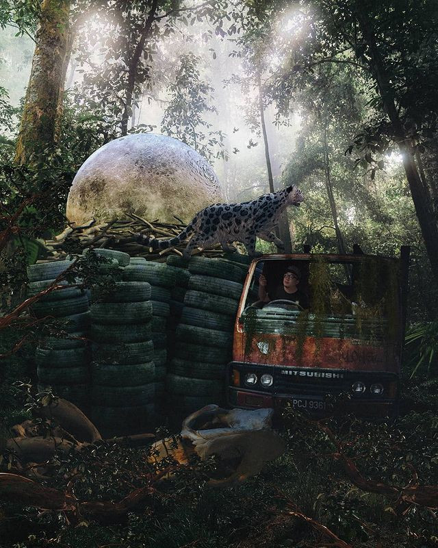 This special series represents YONGL’s creative participation with Mitsubishi Motors Malaysia. The artwork in this series is built on the foundation of Mitsubishi’s slogan, “Drive your Ambition”, which states a strong commitment to the values and aspirations of its drivers. This series tells the story of a man behind the wheel of a Mitsubishi who transports the moon, a recurring concept which signifies dreams and ambitions, from the forest into the city.