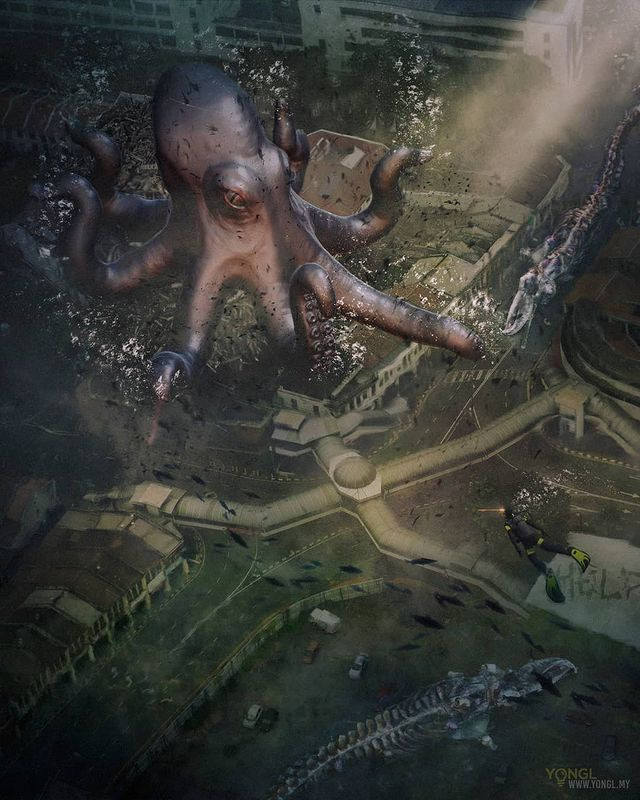 Lest we forget the creatures that dwell in the seas that surround our Peninsular. Inspired by the shapes and forms of real life architecture, YONGL reimages sea creatures in submerged versions of the cities and towns we call home.