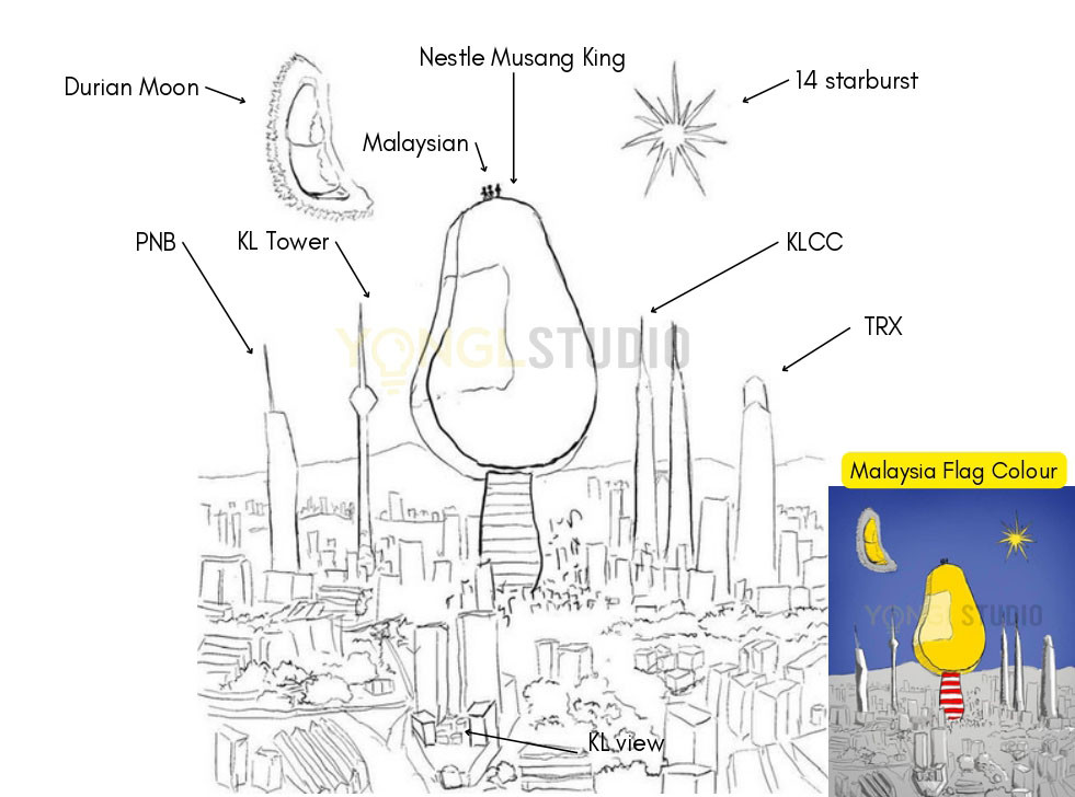 Whatever your opinion on this controversial fruit is, we cannot deny the fact that the durian is a national treasure of Malaysia. That is why many Malaysian brands love experimenting fusions of durian with other beloved foods and Nestlé Malaysia is no exception to the rule with its innovative Nestlé Musang King Ice Cream! Once YONGL taste this ice cream, he knew that he had to visually depict the unique flavour combination against the backdrop of the Malaysian landscape that this ice cream is meant to celebrate. Thus, this symbolic visual was born.